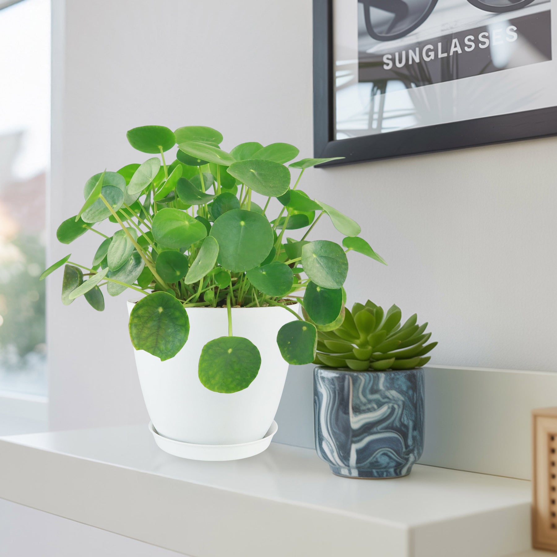 The full-grown Chinese Money Plant is popular for its easy-care nature, unique round leaves, and air-purifying qualities, making it a great decorative houseplant for modern interiors. Its upright, architectural look adds charm to tabletops, shelves, or hanging planters.
