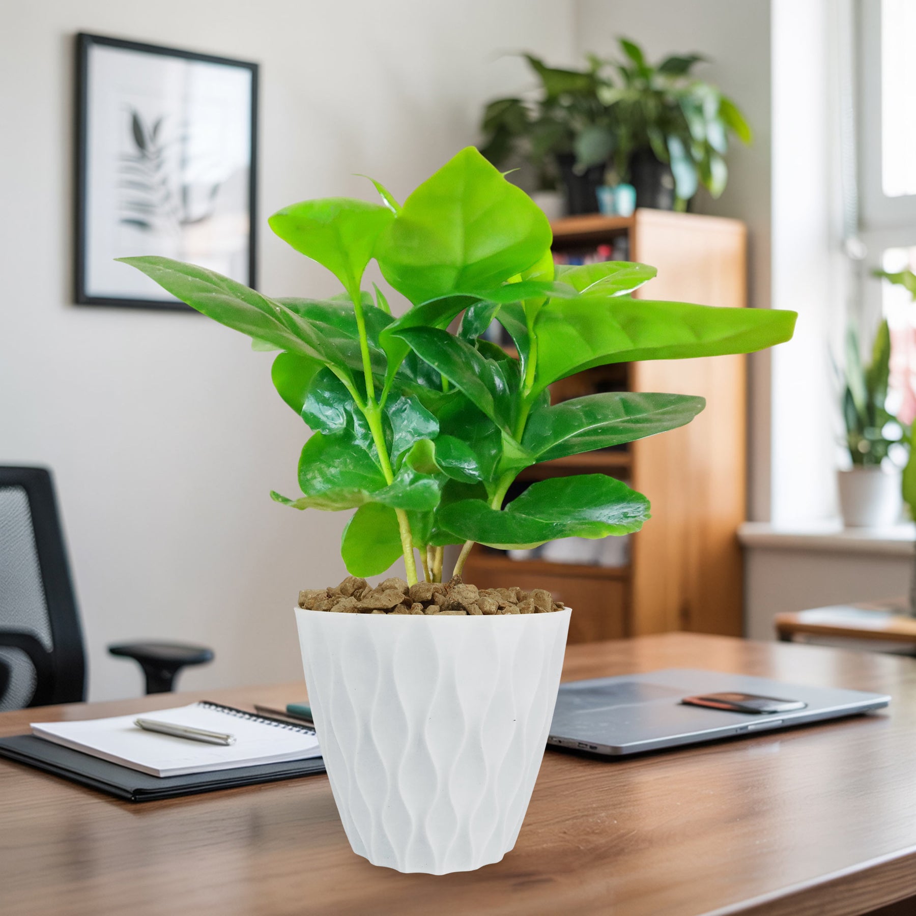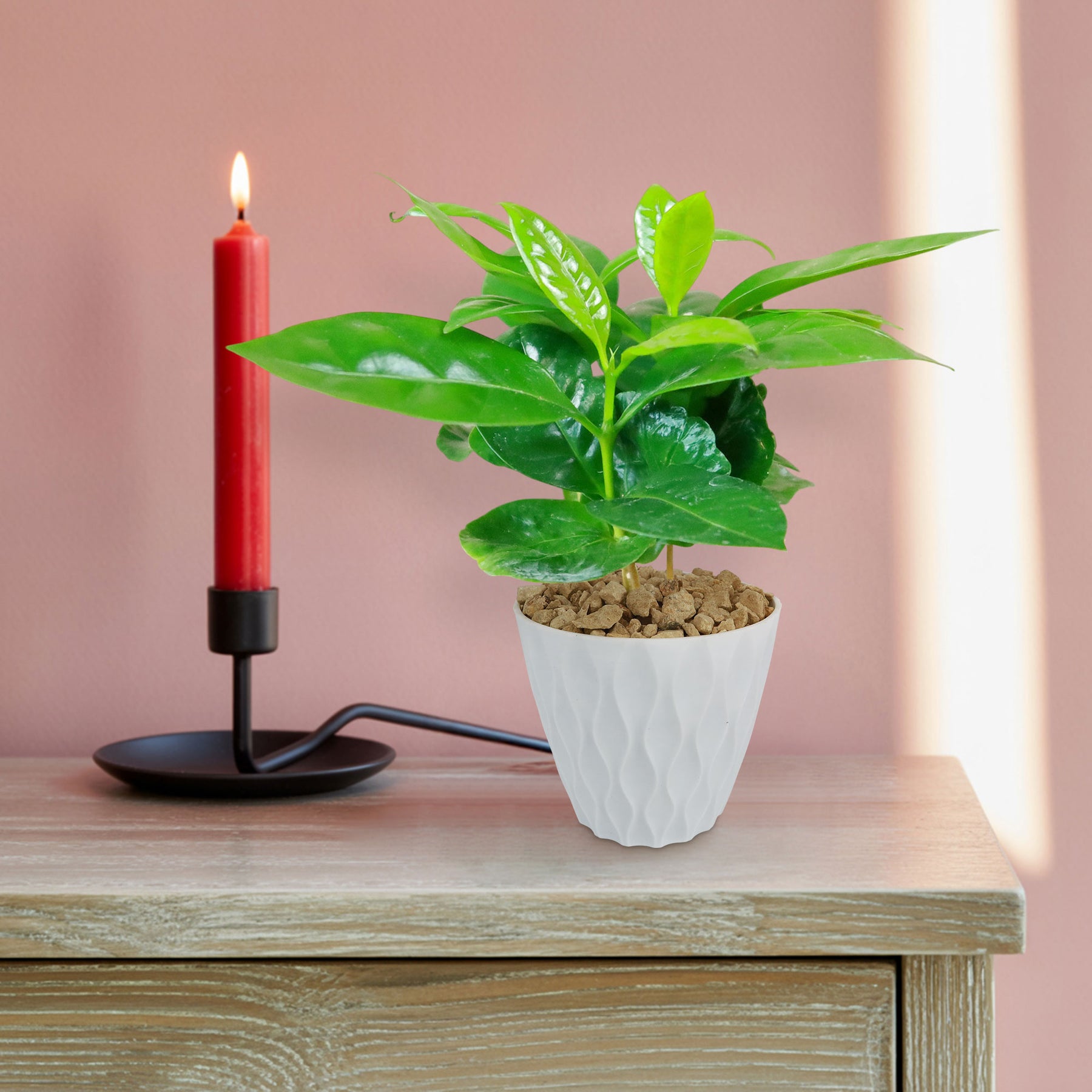 Overall, Coffee plant (Coffea arabica) is a rewarding plant, offering lush green foliage, fragrant blooms, and even homegrown coffee beans under the right conditions. With proper watering, bright indirect light, and well-draining soil, this plant thrives indoors and outdoors in warm climates. Its star-shaped, jasmine-scented flowers attract pollinators, while its vibrant red cherries house the prized coffee beans. Additionally, Coffea arabica has a lower caffeine content than Robusta coffee, resulting in a smoother, less bitter taste—one of the reasons it is favored for specialty coffee production. With a lifespan of several decades and peak productivity in its early years, this plant is both an ornamental and functional addition to any space, making it ideal for coffee enthusiasts and plant lovers alike. Order your very own coffee plant for sale today!