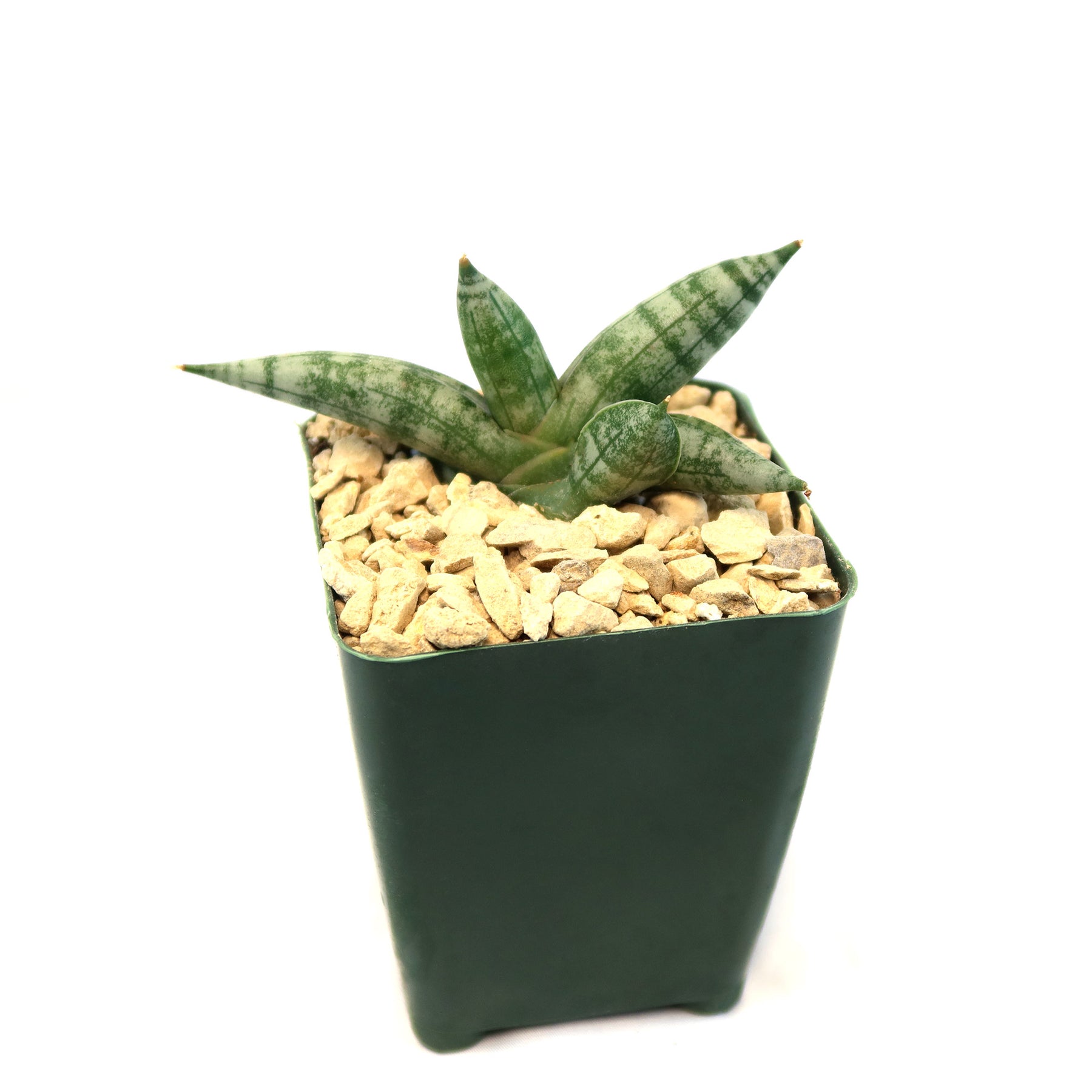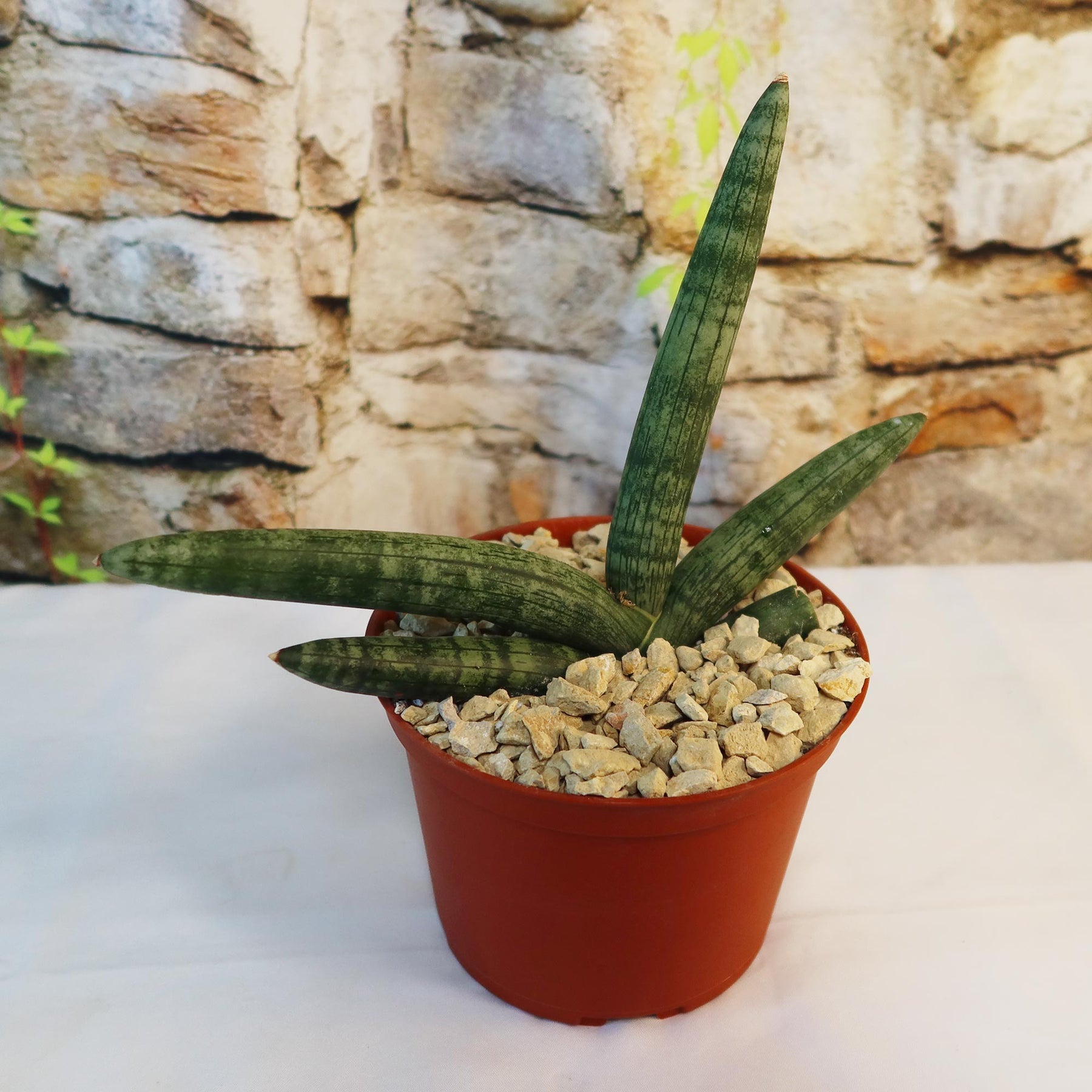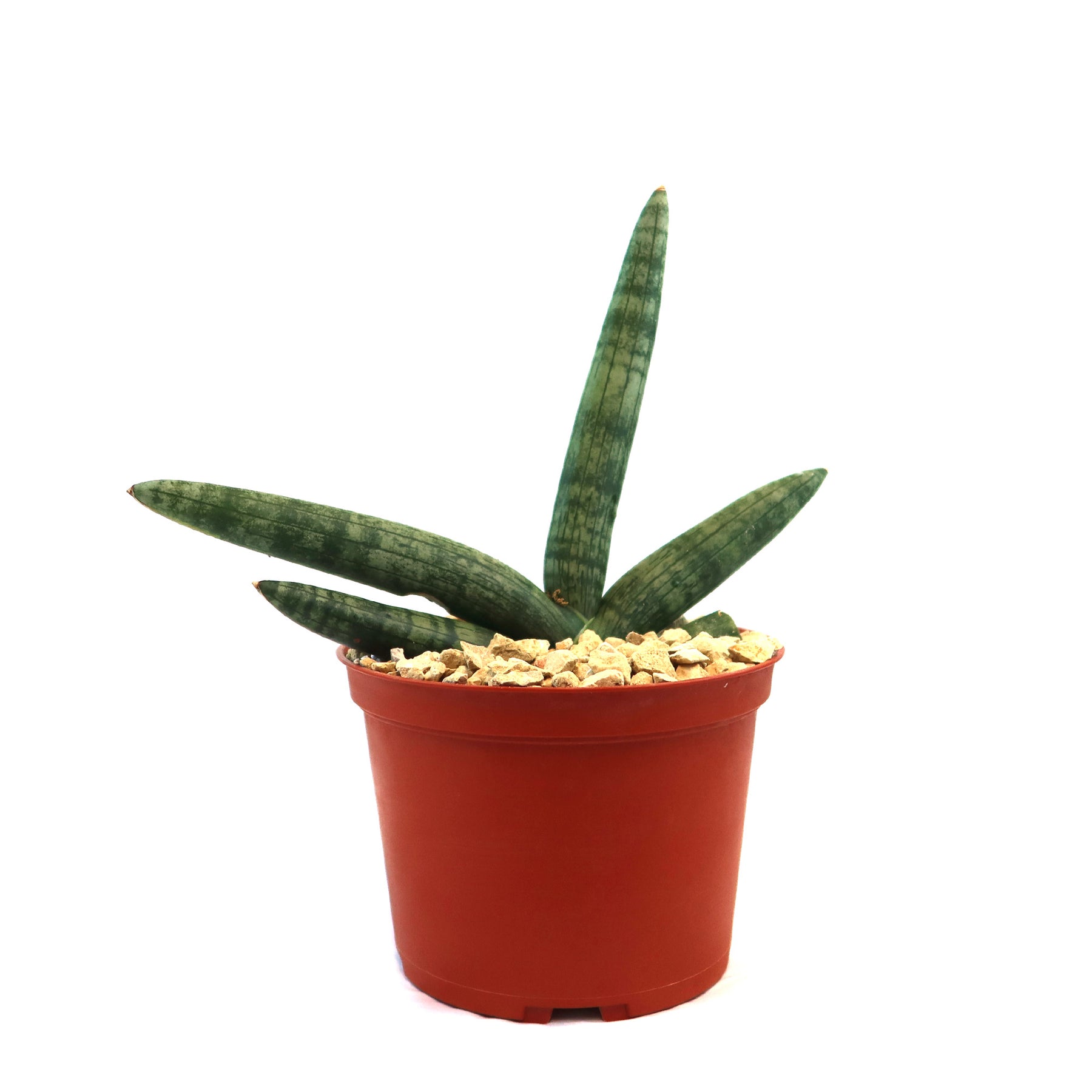 This snake plant does not have ordinary upright, dark-green leaves; they are horizontally striped and have an extraordinary cylindrical fan shape that tapers to a fine point at its tips. The single leaf of this spear sansevieria can grow up to 7 feet tall and up to 1.4 inches wide.