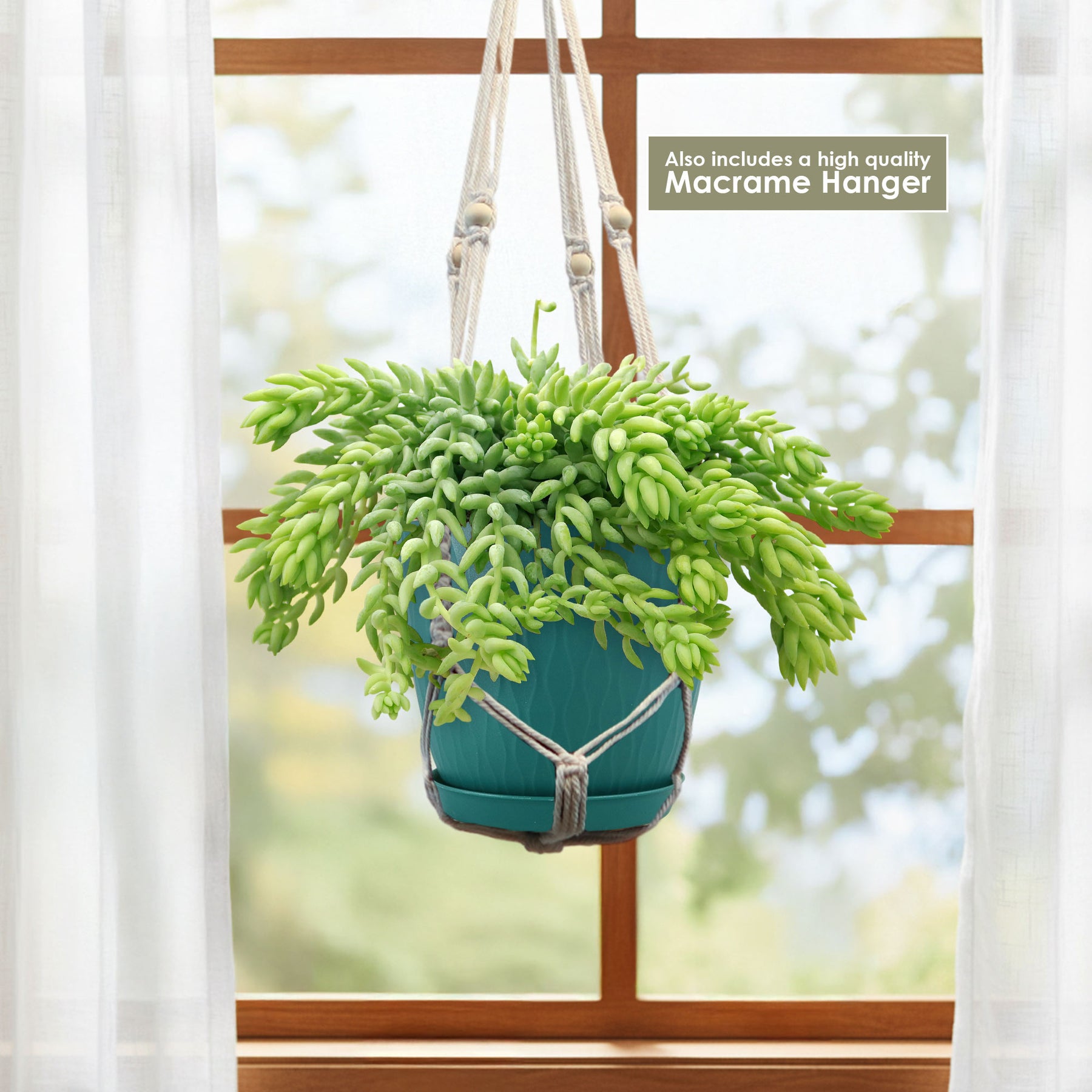 The donkey tail plants can grow up to about 4 feet long and 2 feet wide, with their trailing stems filled with chubby, succulent leaves. Its leaves store water, making it a drought-tolerant plant. Plus, it's known for its distinctive trailing growth habit, making it a popular choice for hanging baskets or as a trailing plant in arrangements.