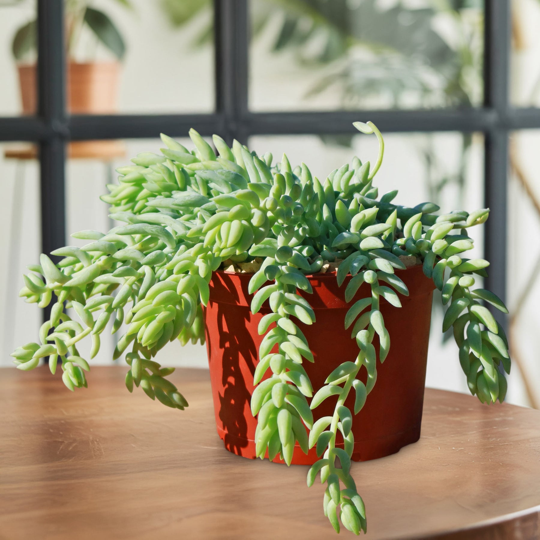 The donkey tail plants can grow up to about 4 feet long and 2 feet wide, with their trailing stems filled with chubby, succulent leaves. Its leaves store water, making it a drought-tolerant plant. Plus, it's known for its distinctive trailing growth habit, making it a popular choice for hanging baskets or as a trailing plant in arrangements.