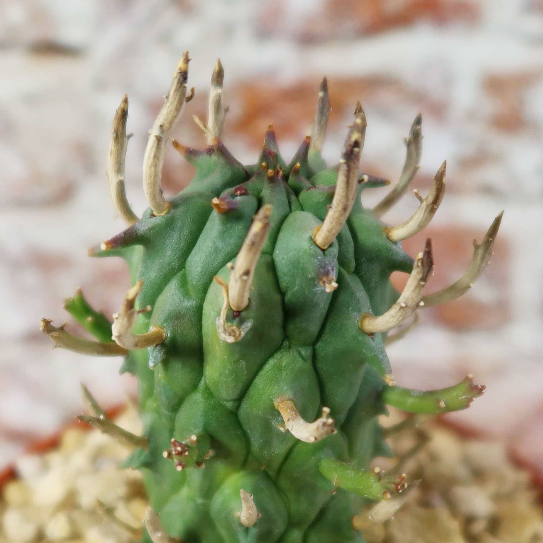 Euphorbia fasciculata is a small pickle shaped succulent srublet with prominent spiny tubercles, sometimes resembling a green pineapple, usually single stemmed but may branch with age.