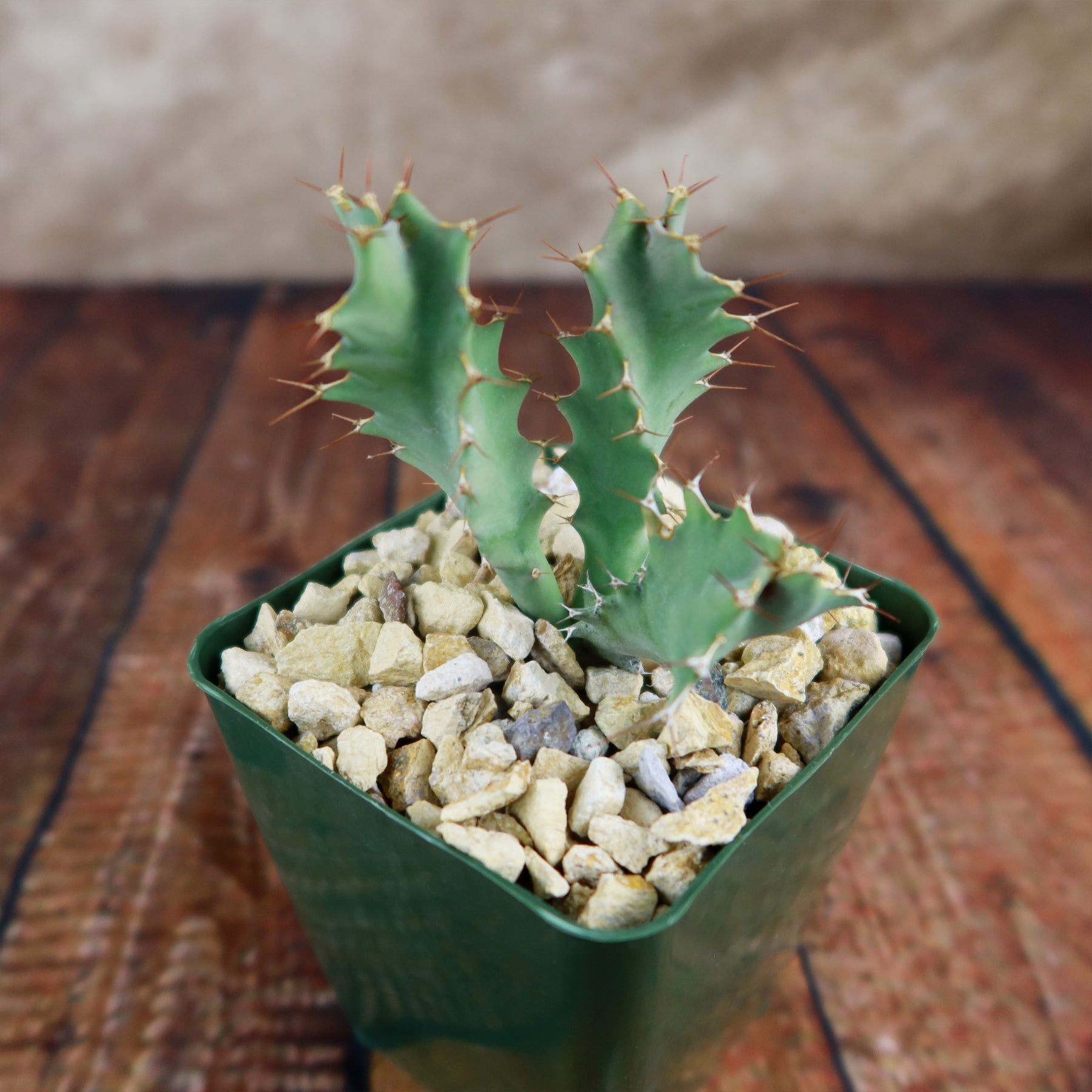The twisted Euphorbia tortirama plant remains a relatively compact, typically growing up to 2 feet tall and spreading slightly wider over time.