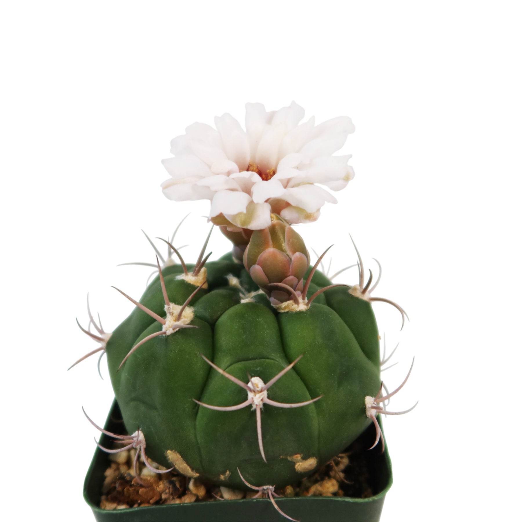 Gymnocalycium marquezii is a solitary or slowly clustering cactus, with peculiar spine clusters characteristically bent backward in a distinctive fashion. Gymnocalycium are very gratifying plants, their culture is easy and their flowering is abundant if we give them a well drained relatively rich substrate.