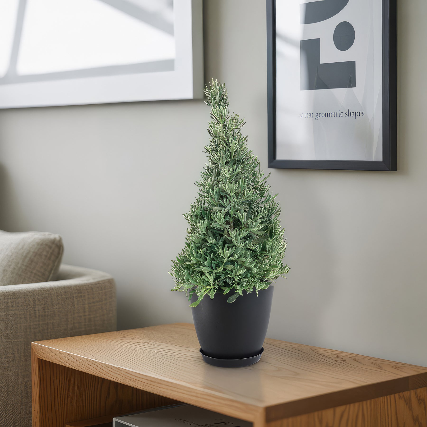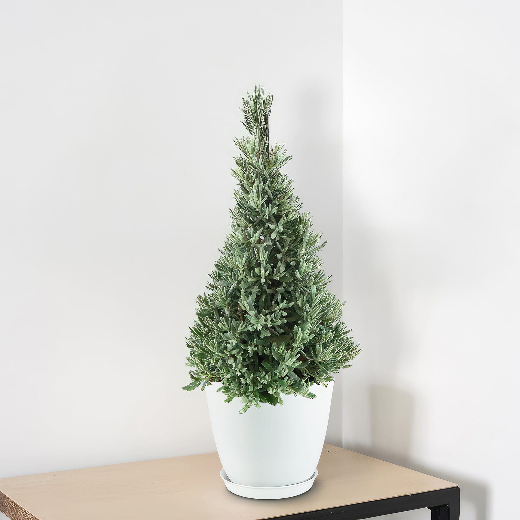 Overall, the Lavender Tree is a perfect blend of festive charm and practical elegance, offering a unique way to celebrate the holidays while enjoying the benefits of a living plant. Its silvery-green foliage, aromatic fragrance, and vibrant blooms make it an eye-catching and versatile decoration, while its easy-care nature ensures it remains a low-maintenance choice. Thriving in well-drained soil and requiring minimal watering, this drought-tolerant plant is also hardy enough to survive cooler temperatures with proper care. Beyond the holiday season, it can be reshaped or grown naturally, providing year-round beauty and functionality. With its sustainable and eco-friendly appeal, the Lavender holiday Tree is a thoughtful and delightful addition to any home.