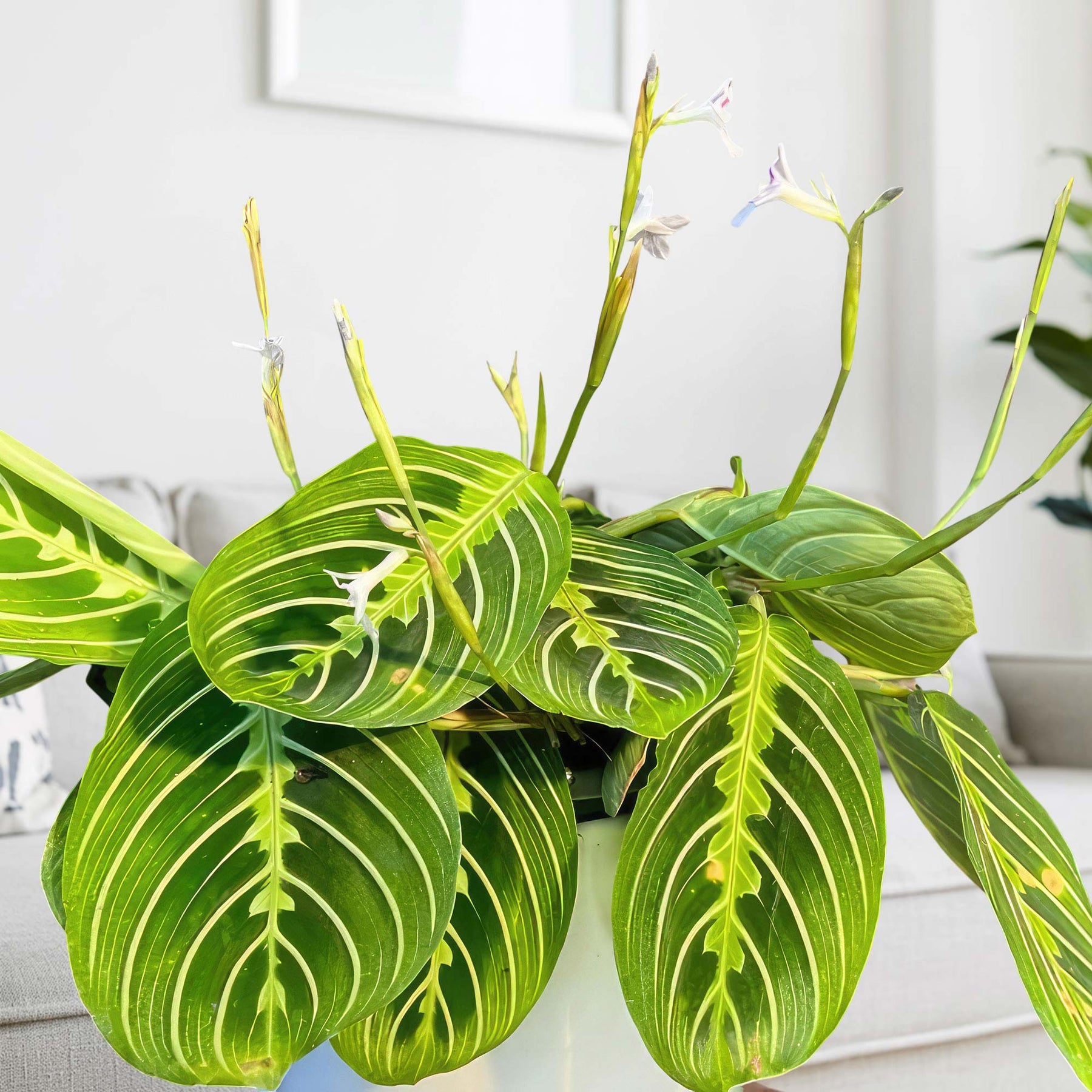 The Lemon lime Maranta flowers are typically white or light lavender and grow on slender stalks, emerging in clusters above the leaves during the spring. Though the flowers are subtle compared to the vibrant foliage, they add a charming touch when they appear. However, flowering is more common outdoors or under ideal humidity and light conditions indoors.