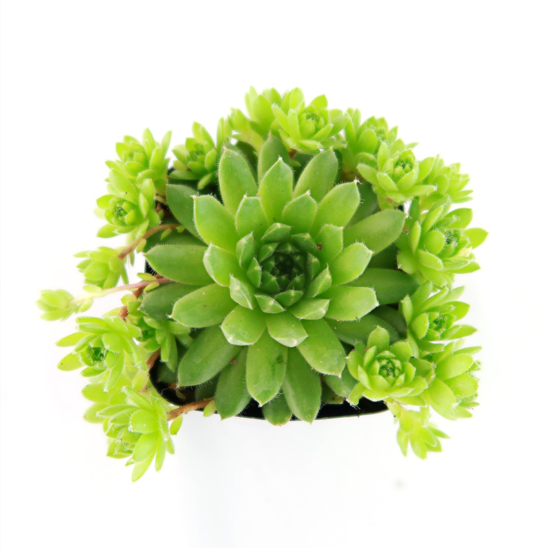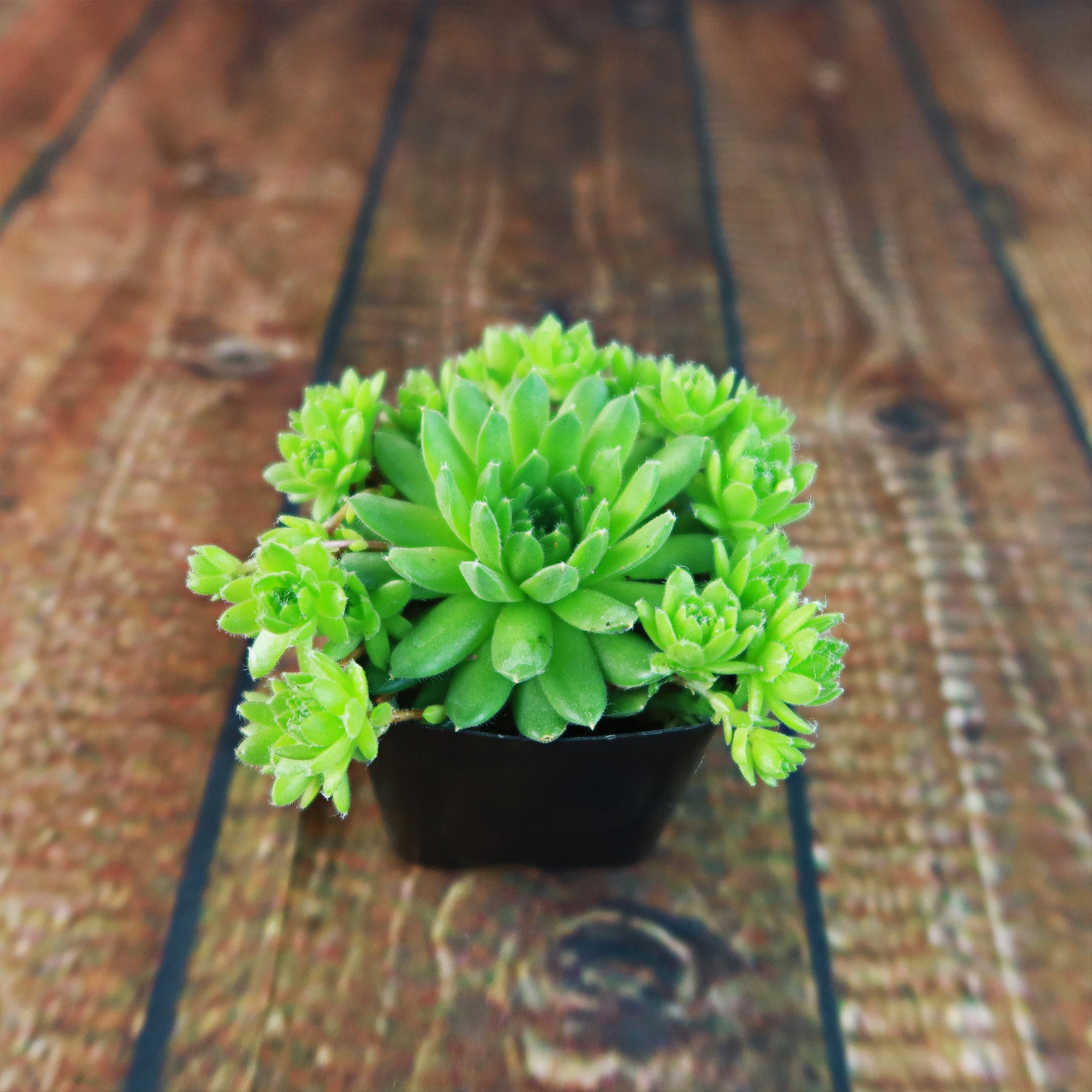 Native to Southern Europe, the Green Wheel Sempervivum rosettes are medium-sized, typically grow up to 5 inches wide, and stay low to the ground, creating a tidy mat that makes it ideal for container gardens, rockeries, or green roofs.