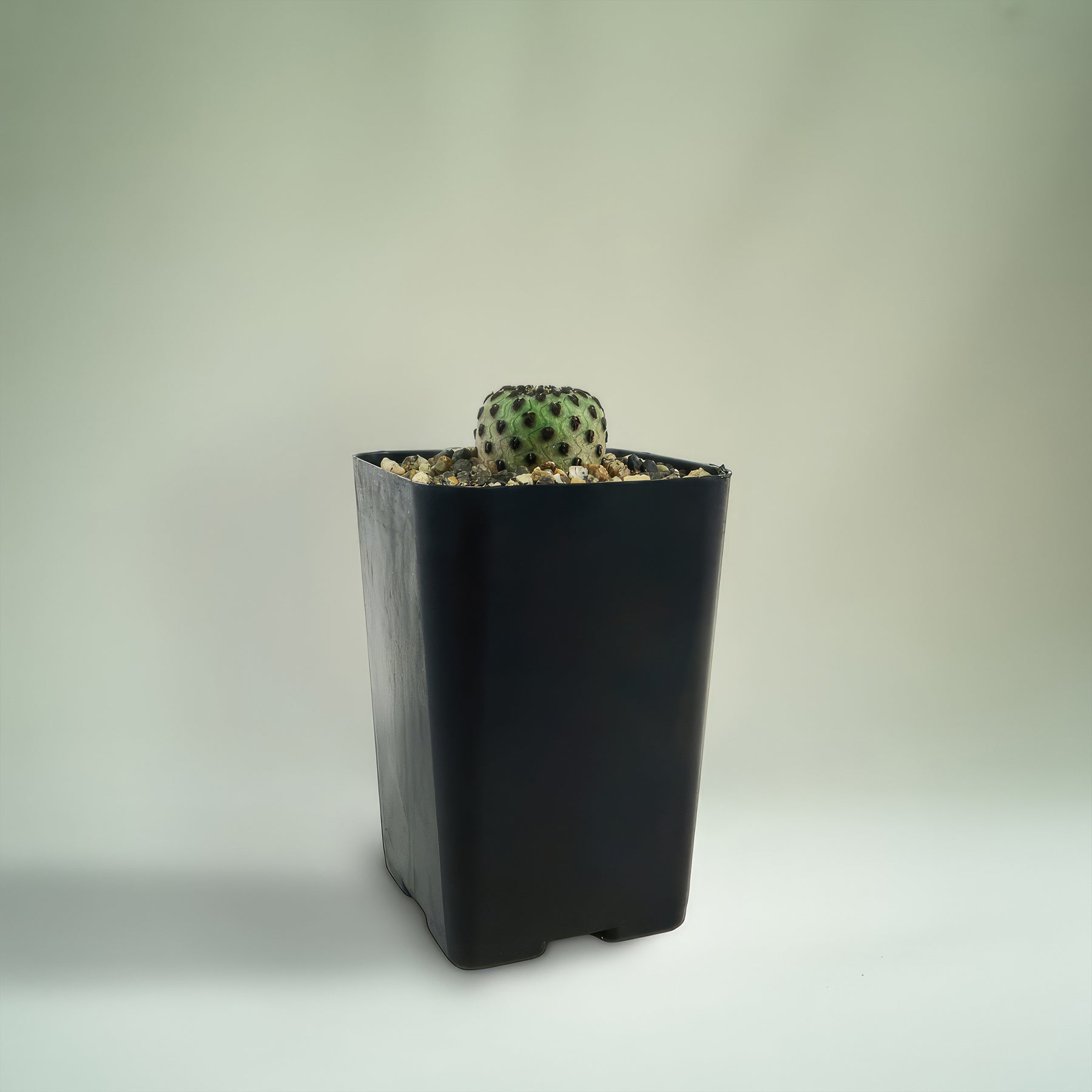 - Each stem is covered in spiral patterns of tubercles and short, black, fine spines, giving the plant a sculpted, ornamental look.