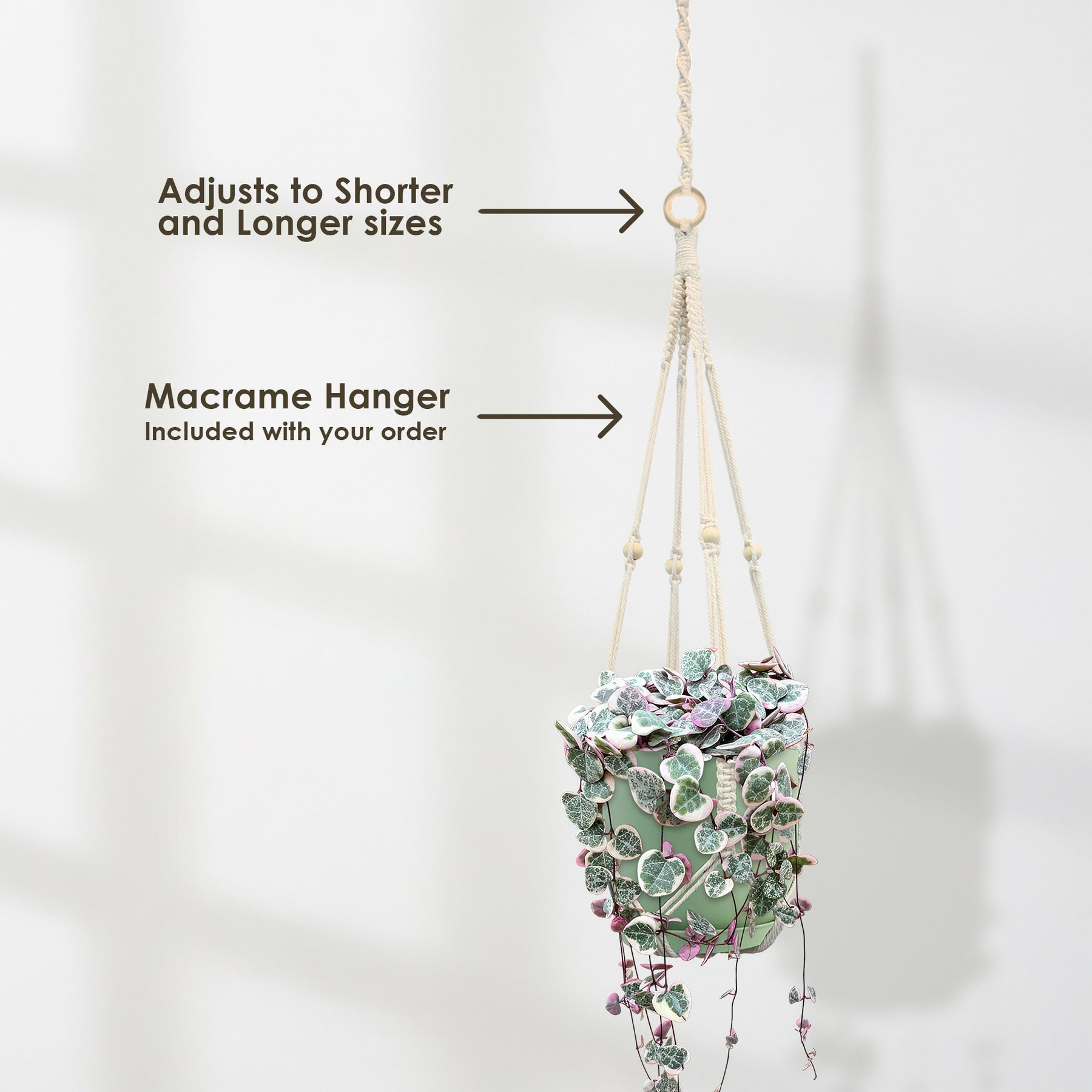 This little variegated string of hearts plant also produces tiny bead-like tubers along its vine that give it the appearance of a rosary heart. This variegated version of the Ceropegia woodii is perfect for hanging baskets and brings an exotic touch to any space.